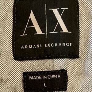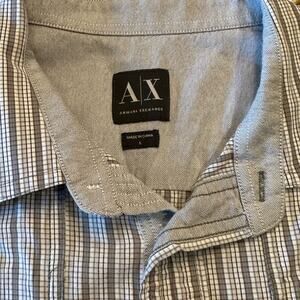 This stylish AX Armani Exchange short-sleeve shirt features a modern gray and white plaid pattern. Crafted from comfortable cotton, it's perfect for casual wear. The shirt is in excellent condition and comes in a size large. Add a touch of designer flair to your wardrobe with this versatile piece! Get it now before it's gone!