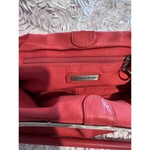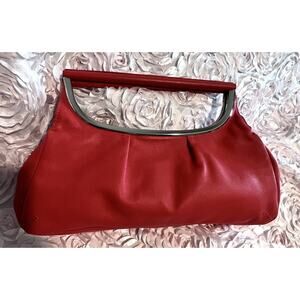 A|X Armani Exchange, Leather Hand Bag with silver hardware, preowned. This is a 100% leather bag by Armani Exchange. It is solid on both front and back exterior and top of bag up to the handle is encased in silver hardware. The bag pulls open and secured by an easy to close and open magnetic closure. The lining is cotton and in the same color as the bag. There is a zippered pocket inside and a metal loop to secure your keys. This is a classic and classy bag. Simple but sophisticated. M-35