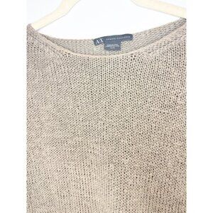 Super soft and beautiful Armani sweater in excellent condition. This sweater is more open knit. The color is a combination of brown, green and grey. The fabric composition tag was cut out but it feels soft. Rolled hemline and two side slits. This is a great layering piece that can get you from spring into fall.