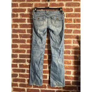 A|X Armani Exchange low rise jeans. Flap back pockets with button down belt loops. Y2K style flare jeans. The back of the hems have some wear from dragging. Light wash color. The measurements are shown in the photos.