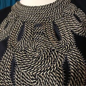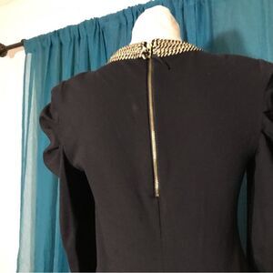 Cute Y2K era black bodycon mini-dress with golden chain applique front design detail, and shoulde paids. Pre-owned in good condition. Please refer to pictures for best description and condition verification.