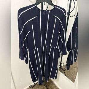 Stylish navy dress with white stripes. Features a tie-front design. Perfect for casual outings. In good condition.