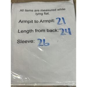 Approximate flat measurements: Armpit to armpit: 21 in, Length from back: 24 in, Sleeve: 26 in