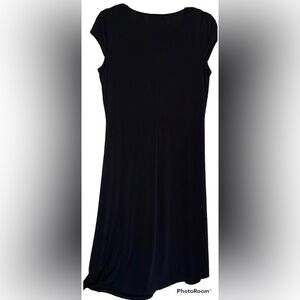 A super soft, comfy lightweight black dress. AXCESS a Liz Claiborne brand, size medium. A deep v-neckline, wide waist band for a smoother fit. A very flattering fit dress. Perfect to go from career to casual. A flowing fuller skirt. This dress has been worn 1-2 times, washed carefully and line dried.