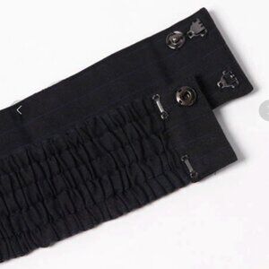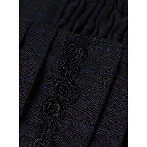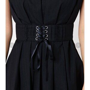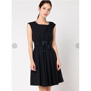 Charming and elegant, this Axes Femme dress features a removable corset belt, contrasting blue pinstripes, and cap sleeves. Corset securely fastens with 2 hook and eye closures and a snap button. Tagged a Japanese size medium, measures about 16" pit to pit, 13" across the waist, and 32" shoulder to hem. There is elastic in the corset belt as well as the waist in back to add stretch. Excellent preowned condition with no major flaws. Smoke free home but we do have pets. BIN31