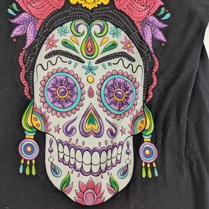 !AY Guey! Black Top With Colorful Embellished Candy Skull Design Medium. Excellent condition. See pics for measurements.