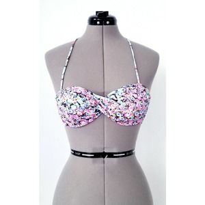 Euro-chic, femme and classic twist bandeau halter BIKINI TOP in a pretty mutli-hue floral print.