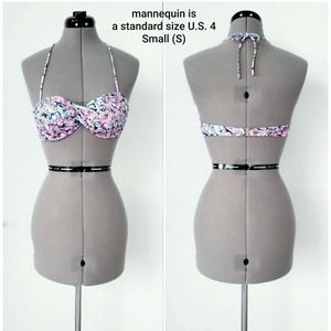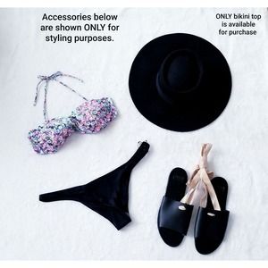 The bikini top has a back hinge closure and removable halter straps to achieve different looks.
