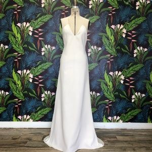 Description: A-line v-neck gown with sheer mesh yoke at neck line. Six ply heavy crepe.