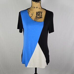 Bold and eye-catching AYIFU tunic top with vivid cobalt blue, classic black, and crisp white in an asymmetrical colorblock design. Soft, stretchy rayon-spandex blend for comfort. Perfect for retro streetwear, artsy outfits, or casual chic looks. Size M, excellent condition.