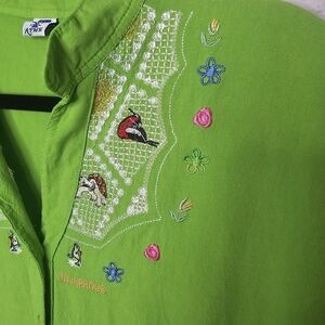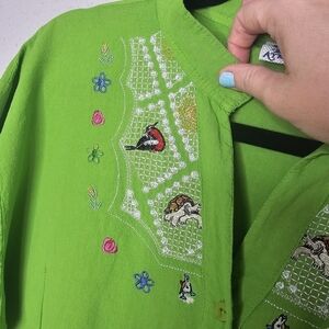 AYME Galapagos Lime Green Embroidered Turtle Blue Foot Boobie Bird Womens Button