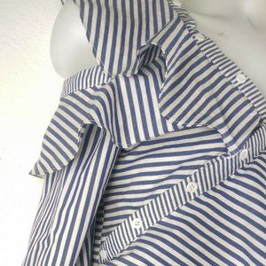 Blue & White Stripe Blouse with ONE Cold Shoulder. Asymmetric buttoned ACROSS chest Ruffled and Buttoned Front