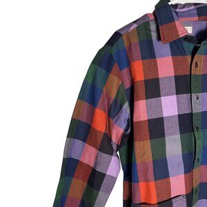 Vibrant plaid design. Long sleeves. Button-down front. Perfect for casual wear.