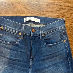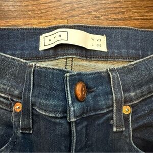 These AYR blue skinny jeans feature a sleek, tapered leg design that offers a flattering fit. The medium blue wash with slight fading provides a stylish, worn-in look. Crafted for comfort and style, these jeans are perfect for any casual occasion.