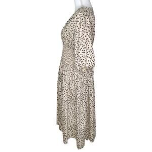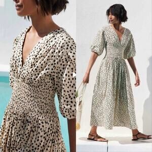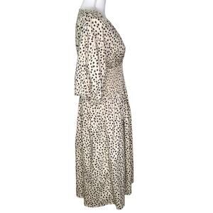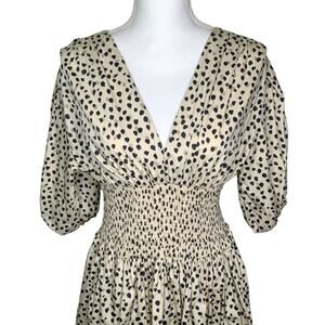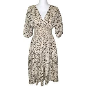 AYR The Extra Extra Soft Spot Animal Leopard Print Smocked Midi Dress. Features poplin fabric, A line silhouette, elbow length puff sleeves with elastic cuffs, hip pockets pullover style with no closure, smocked elastic waist, v neck, spot print, mid length, unlined.