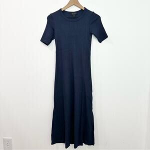AYR The Moderne Ribbed Jersey Knit Side Slit Midi Dress Short Sleeve Navy XS