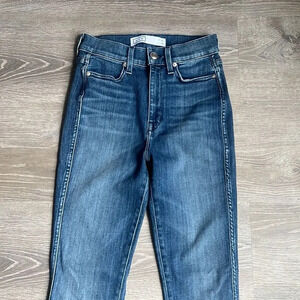 AYR The Riser Skinny Jeans High Rise Stretchy Denim Raw Hem Neon Jupiter in medium dark wash with distressing