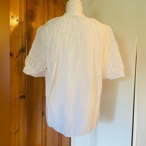 This crisp white blouse from AYR features charming puff sleeves and distinctive smocking on sleeves and collar, offering a blend of elegance and casual style. The details add a touch of sophistication, making it a versatile piece for any wardrobe. Its relaxed fit and fluttery silhouette ensure comfort and style for any occasion.