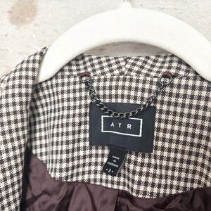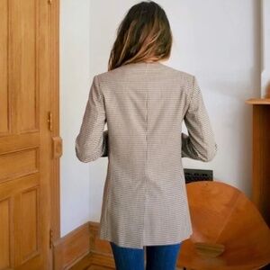 Features: open front blazer, single back vent, two front pockets, 3 button cuffs, fitted style, longer length for slimming silhouette, allover check plaid pattern in brown and cream Brown/cream check pattern that almost looks like houndstooth