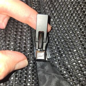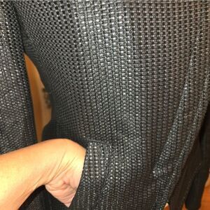 Elegant black blazer by AYR women's size 2. Versatile and chic great with jeans or with black slacks. The pattern looks like silver or dark gray with the black. It has a very heavy zipper on an angle, and it's made well.