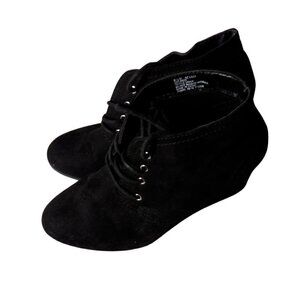 Get ready to step up your shoe game with these stylish AZ Lilly heeled black booties. Made with quality suede fabric, these booties have a pointed toe shape and tie closure for a snug fit. Featuring a 3 inch platform height, these booties are perfect for any occasion - from party and cocktail events, to casual and business settings.The adjustable strap and adjustable features provide a comfortable fit for all-day wear. The ankle shaft style, solid pattern and modern theme make these booties a must-have. The wedge heel style adds a touch of sophistication, while the synthetic lining and insole materials provide durability. These booties are sure to complement any outfit, and are perfect for any season - winter, summer, fall or spring.