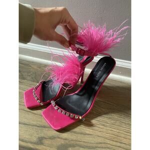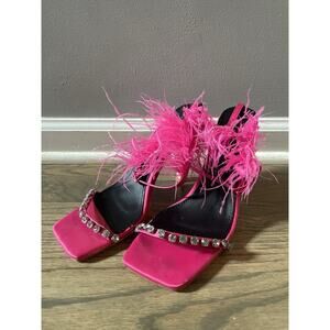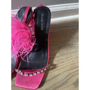 AZALEA WAN FEATHER SANDAL IN FUCHSIA BARBICORE PINK FEATHER HEEL Size 10. Condition is Pre-owned - Good. Shipped with USPS Ground Advantage.
