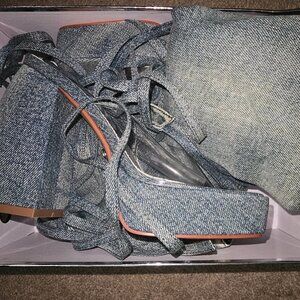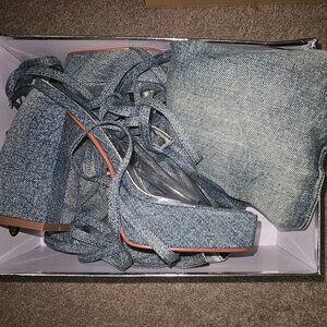 Take your look higher with The AZALEA WANG Aerial Blue Denim Wash Sandal. This unique platform sandal features a square toe silhouette, a curved chunky heel, a denim textile fabrication, and a PVC toe strap. Complete with a metallic faux leather insole, a rubber outsole, and detachable washed denim leg warmers with interlocking panel overlays, and an ultra-strappy tie up design.