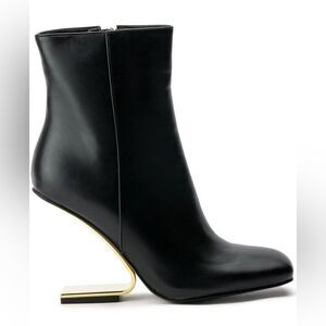 Set new trends with The AZALEA WANG Fashionista Bootie In Black! This smooth vegan leather bootie features a square toe silhouette, a mid-calf height shaft, an inverse-style gold metal heel, and an inner ankle zipper closure.