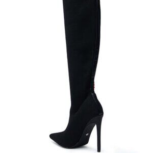 Be a serpent goddess in The AZALEA WANG " CALCULATED COBRA " Black Embellished Snake Boot. This bold style boasts a semi-stretchy woven knit base and features a pointed toe silhouette, a slim stiletto heel, a knee-high shaft, tonal stitching, and tonal faux leather trim running up the back. Complete with an intricate snake design on the inner panel adorned with intricate rhinestone and bead detailing, a faux leather back pull tab, and a slip-on fit.