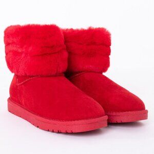 The AZALEA WANG Cozy Mode Flat Bootie in Red is a plush cold weather boot featuring a faux suede upper, a tonal faux fur lining and shaft exterior, an ankle shaft height, rounded toe, ribbon ankle loop, and flat sole.