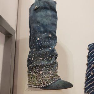 AZALEA WANG "Carrie Underwood" Allo Denim Crystal Knee High Heel Boots NWT
