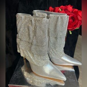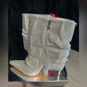 The AZALEA WANG Chilton Silver Chainmail Drape Bootie is made from a sparkly metallic vegan leather upper and features a pointed toe silhouette, a mid-calf shaft height with a layered, pleated, rhinestone-embellished chainmail drape overlay, a slightly covered slim stiletto heel, and an inner ankle zipper closure.