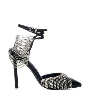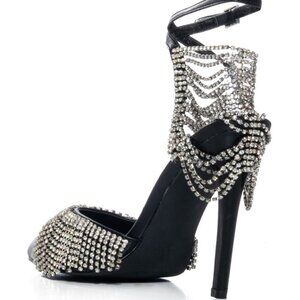 Credit where credit is due. You’ll look way too cute in The AZALEA WANG " DESTINCTIVE DRAMA " Diamond Drip Pump in Black. This sparkling statement shoe features a faux leather upper, a pointed toe silhouette, a cushioned insole, a stiletto heel, and an embellished topline with rhinestone link fringe. Complete with a wrap-around ankle strap, a silver metallic ankle buckle accent, and draped ankle rhinestone-link detailing. Style with a knit midi dress and faux leather jacket for a finished look.