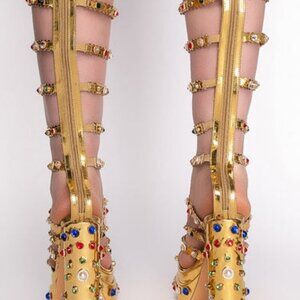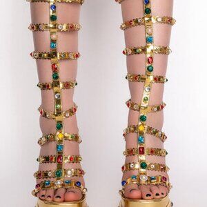The AZALEA WANG "GLADIATOR GOLD " Chunky Sandal in Gold is a heavily embellished gladiator sandal featuring a strappy upper set on a chunky heel with gemstone, pearl, and rhinestone detailing. Complete with a metallic patent leather fabrication, a platform sole, and a back ankle zipper.