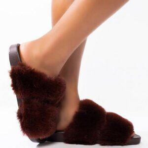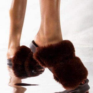 Stay lowkey in luxury with The Azalea Wang Let's Stay In Flat Sandal In Brown. This chic slide features a squared, open toe design, a flat, gummy sole, and dual faux fur straps across the bridge. Wear with your fave athleisure pieces and a swipe of lipgloss for an elevated Netflix-and-chill ensemble.