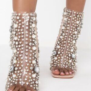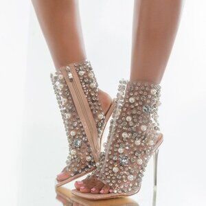 The AZALEA WANG Living The Life Stiletto Bootie In Nude features a clear PVC upper shaft with rhinestone and pearl embellishments, a peep toe detail, a stiletto heel, an open back heel, and an inner zipper closure.