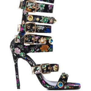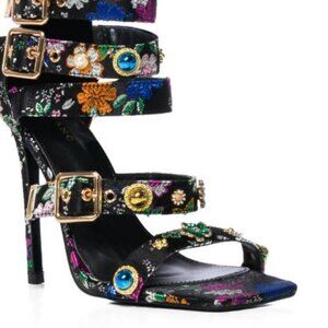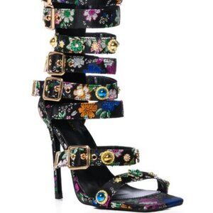 Shoes fit for the queen you are. The AZALEA WANGr PASTEL PERFECTION BROCADE " ENBODIED GLADIATORSandal in Black is a heavily embellished gladiator sandal featuring a strappy, floral brocade upper set on a slim, stiletto heel. Complete with floral rhinestone accents and luxurious gemstone detailing. Complete with a mid calf shaft, an open square toe silhouette, decorative metallic buckles, and a back ankle zipper.