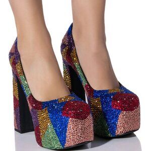 The AZALEA WANG " RHINESTONE EMBELLISHED ROYALTY " Pump In Multi is finally here! This bold and shiny heel features a colorful colorblocked rhinestone base fabrication, a platform silhouette, a towering chunky heel, a closed square-toe, and a faux leather insole. Pair with your fave mini dress and a moto jacket.
