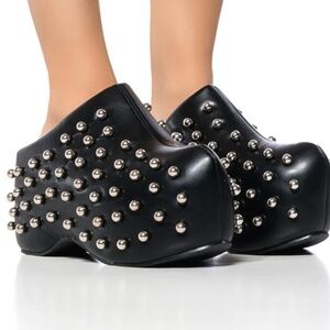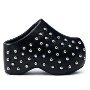 Scandi style gets an edgy upgrade with The AZALEA WANG Romesco Black Embellished Clog. This faux leather style features an almond toe silhouette, a slip-on fit, a chunky heel, and a curved platform so