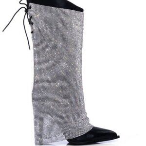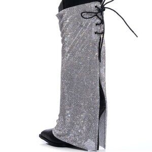 The AZALEA WANG " TAKE COVER " Embellished Stiletto Boot In Black is an enticing, glimmering below-the-knee pair featuring a faux leather base and a rhinestone chainmail covered shaft with a back lace-up detail. Complete with a pointed toe, a slightly covered slim stiletto heel, and side zipper closure. Pair with mini dresses and mini bags for an extra edge.