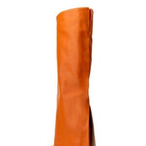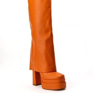 Your style star status is showing. The AZALEA WANG " THE ULTIMATE FOLD " Knee High Fold Over Chunky Boot in Orange is a luscious vegan leather boot featuring a knee high shaft, a fold over shark boot silhouette, an elasticated shaft for ultimate comfort, and a slightly covered chunky heel. Complete with a squared toe, platform sole, and slip on fit.