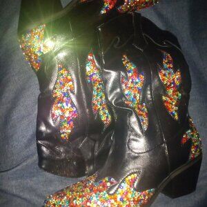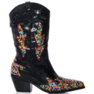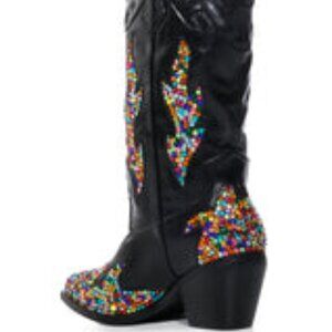 Add an extra bling to your ensemble with The AZALEA WANG " WILD WESTERNER " Embellished Western Bootie. This glam cowboy boot features a faux leather upper, pointed toe, mid calf height, a rounded Western-inspired shaft silhouette, chunky block heel, and slip-on fit. Complete with colorful rhinestone embellished flames and design.