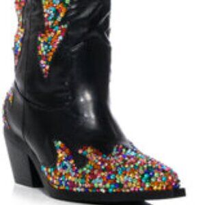 Add an extra bling to your ensemble with The AZALEA WANG " WILD WESTERNER " Embellished Western Bootie. This glam cowboy boot features a faux leather upper, pointed toe, mid calf height, a rounded Western-inspired shaft silhouette, chunky block heel, and slip-on fit. Complete with colorful rhinestone embellished flames and design.