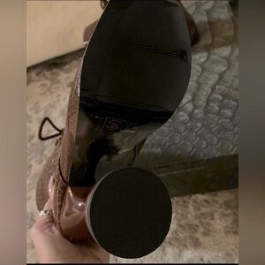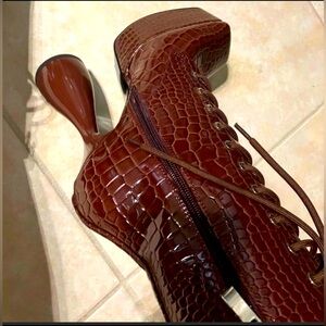amazing zip up lace up brown shiny croc print faux patent leather boots with flared unique chunky platform heel and square toed