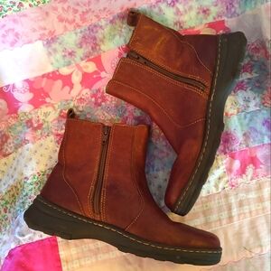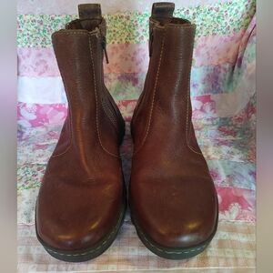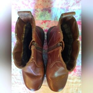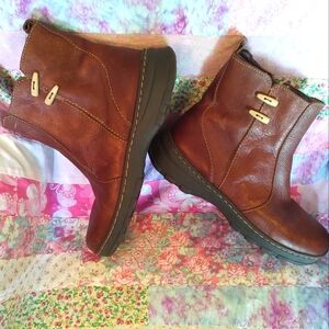 AZALEIA BROWN LEATHER ZIP UP ANKLE BOOTS with FAUX BONE BUTTON DETAIL. SZ 7.