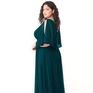 Feel like a greek goddess while wearing the Temeka bridesmaid dress. Made from chiffon, this floor length dress features delicate sleeves with slits that flow down to the elbows as well as a flattering V-neckline and pleated waistline. Temeka features a spaghetti tie back detail that rests on the back neckline, an A-line skirt silhouette encircled with gathering, and is finished with a leg slit.