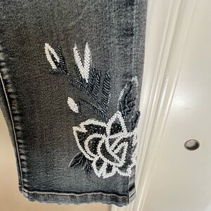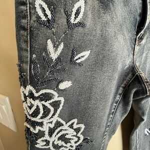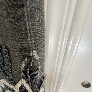 Good preowned fun beaded mid rise distressed black denim capri jeans. A few beads are missing not super noticable. Please see photos for condition information and measurements. Dry Clean Only😭. Thank you!