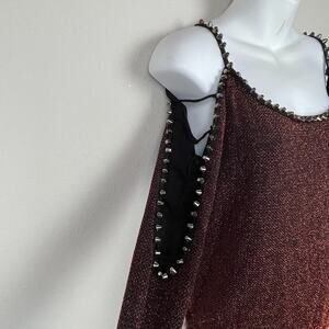 A.Z.I Jeans women's top in size Small, featuring glittery studded trim and edgy lattice cutout long sleeves. The ruched sides offer a flattering fit, while the stretchy nylon blend adds comfort and movement. Perfect for a night out or adding a gothic glam touch to your wardrobe.