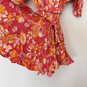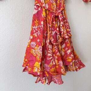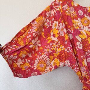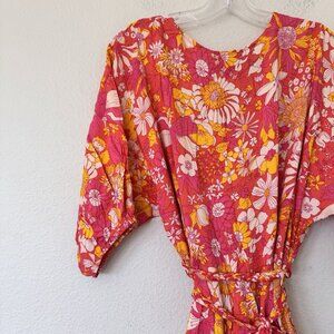 This Aakaa dress is a multicolor mini dress in size medium for women. It features a floral pattern, short dolman sleeves, a round neckline, and a tie waist for a flowy fit. The dress is made from lightweight fabric and is perfect for occasions like travel, weddings, parties, or casual wear. The bohemian, colorful design with a hippie vibe is ideal for the summer, fall, or spring seasons.