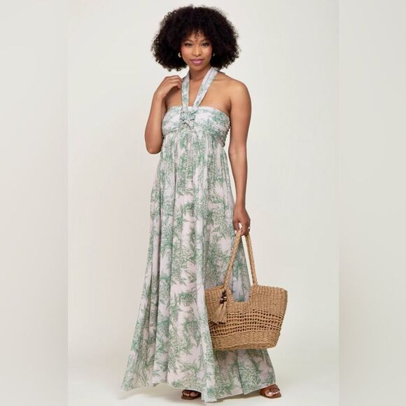 Step out in style with this elegant green halter maxi dress. Perfect for any occasion, this dress combines comfort and sophistication. The flowing design and halter neckline add a touch of elegance to your wardrobe. Sheer but lined, wear tied in a bow or up over the neck.